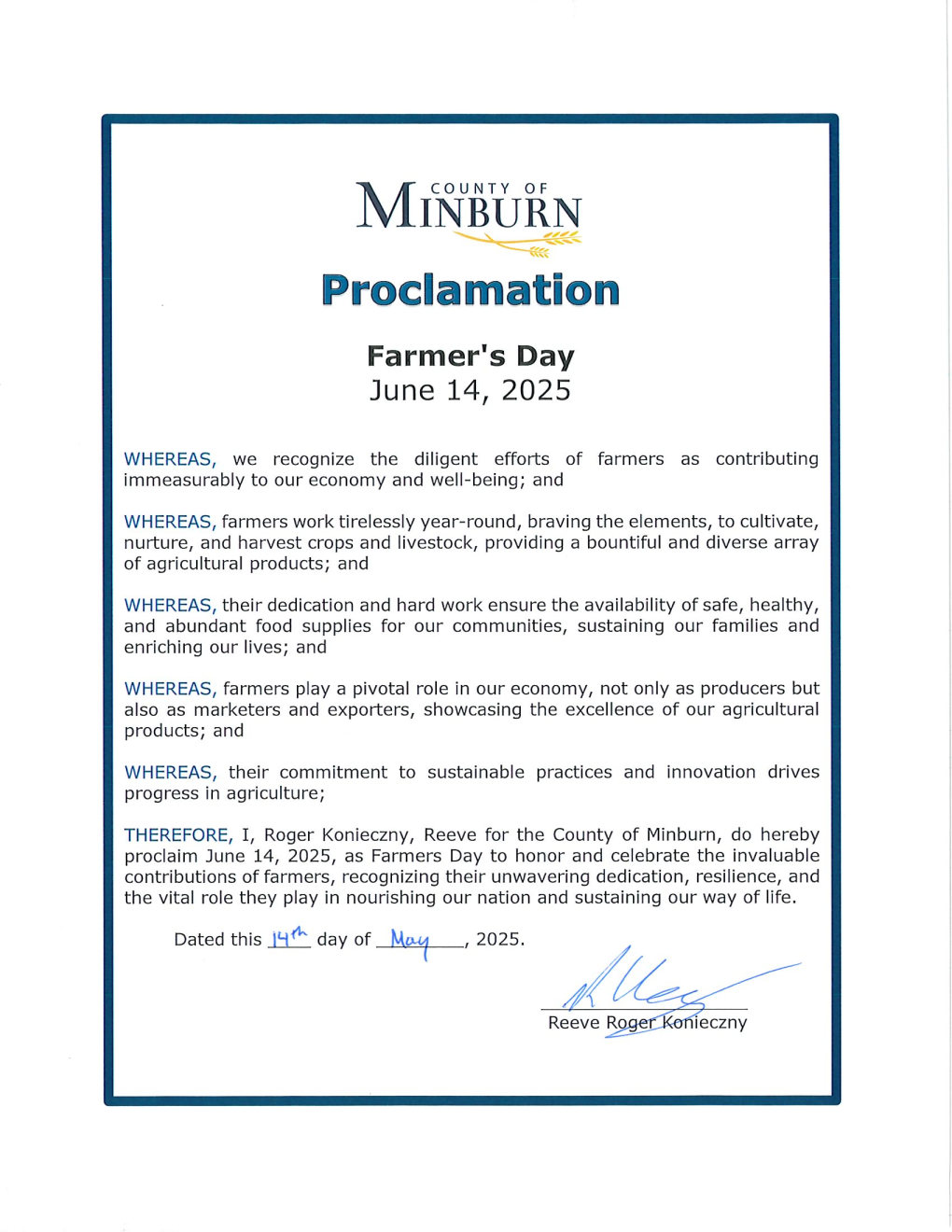 On behalf of the County of Minburn, Reeve, Roger Konieczny has proclaimed June 14, 2025 as Farmers' Day.